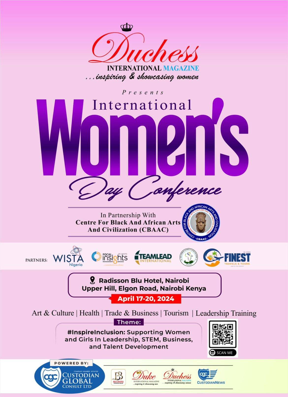 Duchess International Magazine and the Centre for Black and African Arts and Civilization (CBAAC) are teaming up to invite women from all over the world to the International Women’s Day Conference 2024 in Nairobi, Kenya. This exciting event is organized by Duchess International Magazine and powered by its parent company, Custodian Global Consult Limited.
