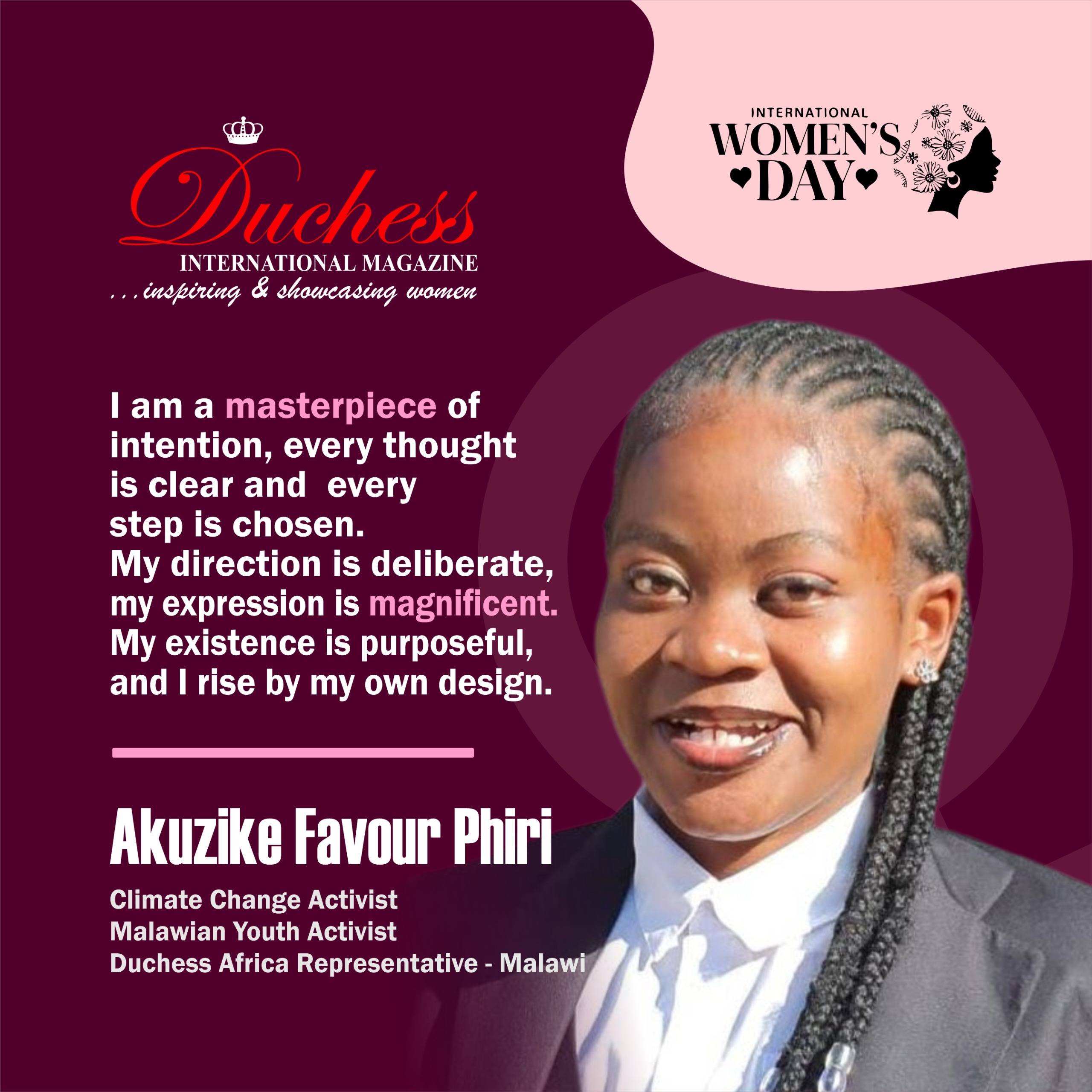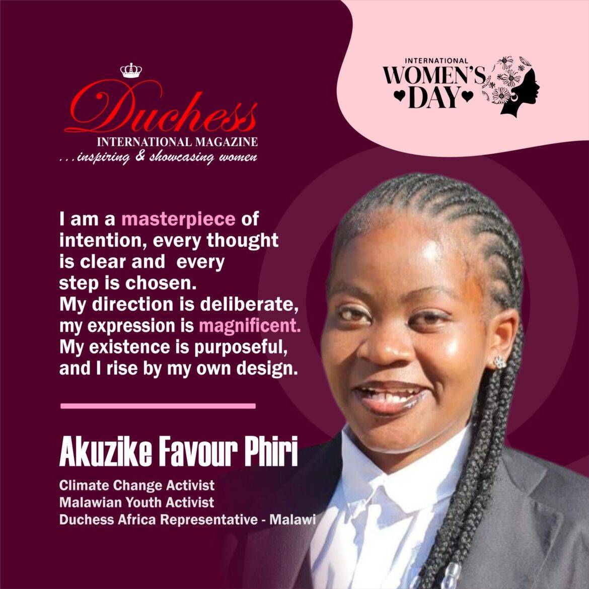 In recognition of her contributions to climate advocacy, youth leadership, and community development, Duchess International Magazine wishes Akuzike Favour Phiri a distinguished Happy International Women’s Day.