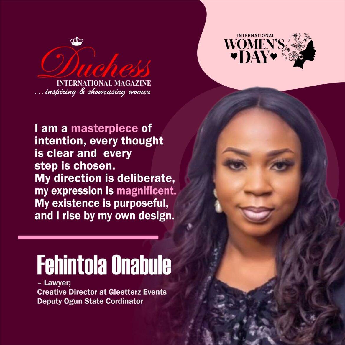 In celebration of her growing impact and dedication to creative excellence and civic engagement, Duchess International Magazine honours Fehintola Onabule and extends warm wishes for a distinguished International Women’s Day.