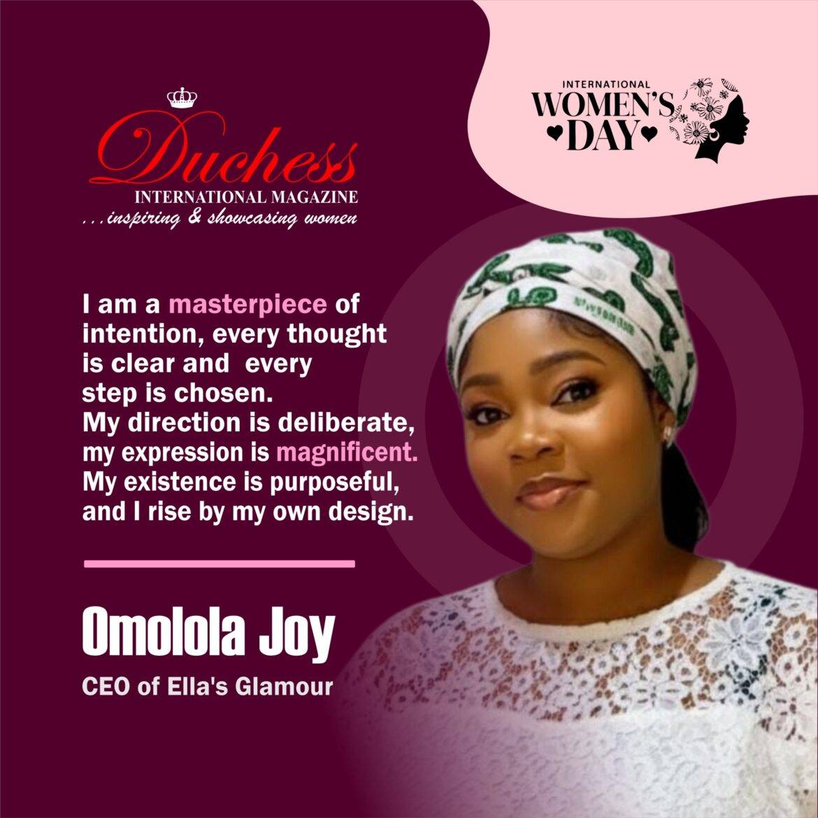 In recognition of her entrepreneurial contribution to lifestyle branding and confidence-driven beauty, Duchess International Magazine honours Omolola Joy and celebrates her creative business leadership.